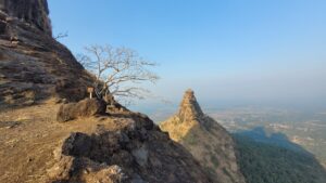 The trek offers scenic forest trails, huge ancient caves, panoramic views from the summit, and a thrilling rock climb near the top—perfect for adventure and photography lovers.